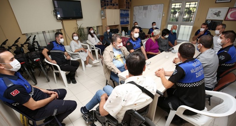 Nilüfer Belediyesi Bizim Ev Engelliler Sosyal Yaşam Destek Merkezi katılımcıları, Zabıta Haftası nedeniyle Nilüfer Belediyesi Bisikletli Zabıta Ekibi’ni ziyaret etti. Ziyarette, Bizim Ev eğitmenleri ile İhsaniye Mahalle Muhtarı Selami Cengiz de yer aldı. Zabıta Teşkilatı’nın kuruluşunun 195. yılını kutlayan Bizim Ev katılımcıları, zabıta ekiplerine çalışmalarında kolaylıklar diledi. Nilüfer Belediyesi Zabıta Müdürlüğü’ne bağlı ekiplerin, engelli bireylerin yaşamını kolaylaştıracak çalışmalar yürüttüğünü dile getiren Bizim Ev katılımcıları, bu çalışmalar için de teşekkür etti. Ziyaret için teşekkür eden Nilüfer Belediyesi Bisikletli Zabıta ekipleri de, sorumlulukları arasında yaya, engelli ve bisiklet yollarına yapılan işgalleri önlemenin de olduğunu belirttiler. Bu konuda titizlikle çalıştıklarını ifade eden ekipler, engelli bireylerin yaşamını kolaylaştıracak ve bu konuda farkındalık yaratacak çalışmaları birlikte yürütmeye devam edeceklerini ifade etti. Engelli bireylerin talep ve önerilerini de dinleyen zabıta ekipleri, fikir alışverişinde de bulundu.