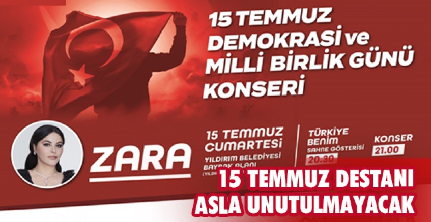Yıldırım Belediyesi, 15 Temmuz hain darbe girişiminin 7’inci yıl dönümünde, anlamlı etkinliklere imza atacak. Yıldırım Belediyesi Bayrak Alanı’nda düzenlenecek etkinlikler 15 Temmuz Cumartesi akşamı saat 20.30’da ‘Türkiye Benim’ sahne gösterisi ile başlayacak. Program kapsamında ünlü sanatçı Zara da saat 21.00’de sahne alacak.
