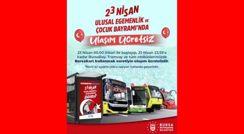 Bursa Büyükşehir Belediyesi, 23 Nisan Ulusal Egemenlik ve Çocuk Bayramı kutlama ve etkinliklerinin coşkulu kalabalıklarla yapılabilmesi için, kent içinde ayakta yolcu taşıyan BursaRay, tramvay ve otobüs hatlarının 23 Nisan günü 00.00 ile 23.59 saatleri arasında BursaKart kullanmak suretiyle ücretsiz olarak hizmet vereceğini açıkladı.