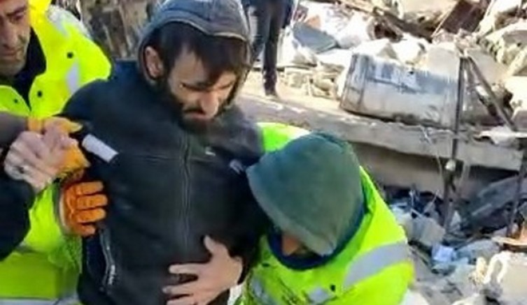 Enkazdan adım atarak çıkan genç adam, sağlık ekiplerine teslim edildi.
