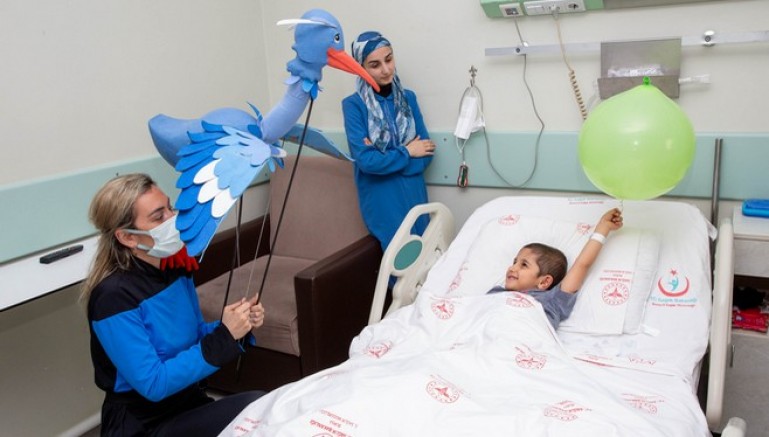 Sağlık Bilimleri Üniversitesi Yüksek İhtisas Eğitim ve Araştırma Hastanesi Çocuk Cerrahisi ve Enfeksiyon Servisi’nde yatan ve ameliyat için bekleyen çocuklar, Büyükşehir Belediyesi Şehir Tiyatrosu’nun sürprizi ile karşılaştı. Belirli periyotlarla hastanelerde hasta çocuklara yönelik oyunlar sahneleyen tiyatrocular, bu kez çocukları hasta yataklarında ziyaret etti. Tiyatrocular İpek Zeylan ve Yüksel Hakverdi özellikle çocukların çok sevdiği ‘Kırmızı Duvar’ adlı oyunda kullandıkları mavi kuş ve tilki kuklaları ile oyundan bölümleri canlandırdılar.