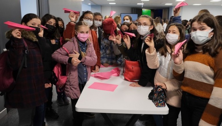 Etkinlikte kız öğrenciler havacılık ve uzay çalışmalarında farkındalık yaratmak için pembe kağıt uçak tasarladı.