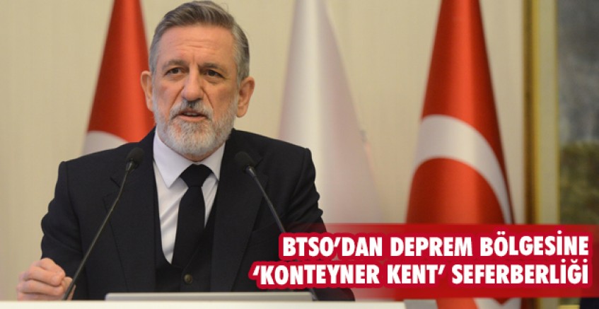 Depremin ilk saatlerinden itibaren harekete geçerek, Bursa Valiliği liderliğinde ve Bursa Büyükşehir Belediyesi ile işbirliğinde kriz masası oluşturan BTSO, 52 bini aşkın üyesiyle depremzedelerin ihtiyaçları çerçevesinde bölgeye 561 yardım trı gönderdi. Bölgeye yönelik gıda ve sıcak yemek desteği için çalışmalarını sürdüren BTSO, iş dünyasının katkılarıyla ayrıca deprem bölgesine bin konteynerlik kent kurulması için harekete geçti.