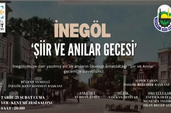 İnegöl Belediyesi ile İnegöl Kent Konseyi, şehrin geçmişi ile geleceği arasında köprü kuracak ve mazinin yad edileceği özel bir gece hazırladı. 21 Şubat Cuma akşamı 20.00’da İnegöl Kent Müzesi konferans salonunda İnegöl’e dair yazılmış şiirler ile geçmişin hatıralarını yaşatan anıların yeniden hayat bulacağı “Şiir ve Anılar Gecesi” düzenlenecek.