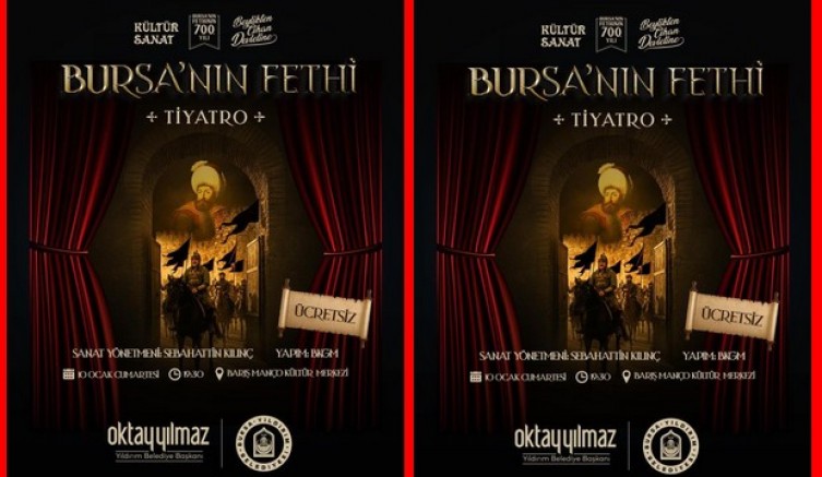Yıldırım Belediyesi Kültür ve Sosyal İşler Müdürlüğü tarafından düzenlenen bir diğer etkinlik ise ‘Bursa'nın Fethi' tiyatro oyunu olacak. Oyun, fetihte önemli bir rol oynayan Balaban Bey'in şahitlik ve anlatımlarıyla, Bursa'nın fethi sürecinde yaşananları sahneye taşıyacak. Sanat yönetmenliği Sebahattin Kılıç'ın yaptığı ve BKGM oyuncularının rol aldığı oyun, Barış Manço Kültür Merkezi'nde, 10 Ocak Cumartesi günü saat 19.30'da sahnelenecek.
