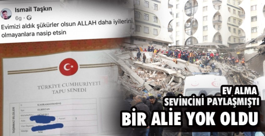 Bölgede binlerce ev yıkılırken binlerce vatandaş da hayatını kaybetti. Kahramanmaraş'ta İsmail Taşkın'ın depremden 4 gün önce aldığı ev de yıkılan evleden sadece birisi. İsmail Taşkın evi satın almasının ardından sosyal medya hesabından, "Evimizi aldık şükürler olsun Allah daha iyilerini olmayanlara nasip etsin" notuyla paylaştı. Taşkın aldığı evin sevincini yaşayamadan eşi ve üç çocuğu ile enkaz altında hayatını kaybetti.