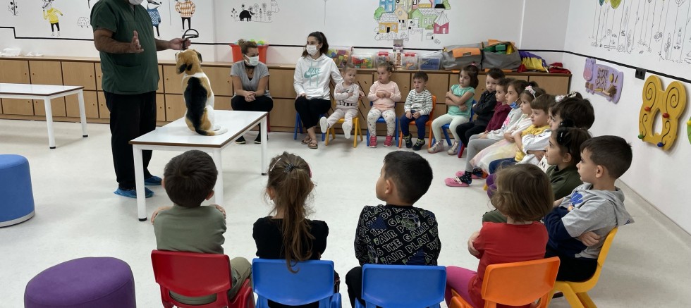 Nilüfer Belediyesi Burak Berk ve Çamlıca kreşlerinde ‘4 Ekim Dünya Hayvan Hakları Günü’ etkinlikleri kapsamında, Veteriner Hekim Erol Kaplan öğrencilerle bir araya gelerek hayvanlar hakkında bilgi verdi. Oyuncak köpek kullanarak hasta hayvanlara uygulanan tedavi yöntemlerini anlatan Kaplan, çocuklarla sahipsiz hayvanların ihtiyaçları üzerine sohbet etti. Çocuklar da Erol Kaplan’a merak ettikleri konularda sorular yönelterek bilgi sahibi oldu.