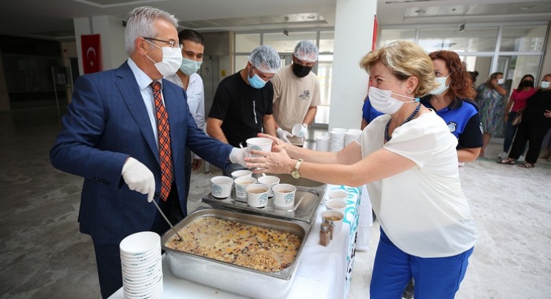 Aşure kazanın başına geçen Başkan Erdem, elleriyle personele ikramda bulundu. Başkan Erdem, paylaşmanın, bereketin artarak çoğalması, birlik ve beraberliğin daim olması dileğinde bulundu.