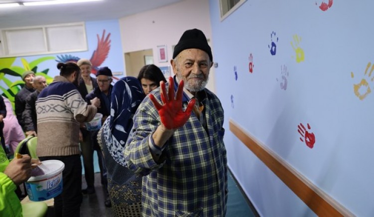 Bursa'da 7'den 70'e toplu tüm kesimlerine yönelik farklı aktiviteleri hayata geçiren Büyükşehir Belediyesi, huzurevi sakinlerinin de sağlıklı bir yaşam sürmesine yönelik etkinliklerine bir yenisini daha ekledi. Gerek kültürel ve sanatsal aktivitelerle dolu atölye çalışmaları gerekse farklı gezi etkinlikleriyle sosyal bir yaşam süren huzurevi sakinleri, bu kez renkli bir etkinliğe imza attı. Büyükşehir Belediyesi Kent Estetiği Şube Müdürlüğü ressamları, huzurevi binası içindeki ortak kullanım alanlarının duvarlarını bir tuval gibi kullanıp, çizimler yaparken, çizimleri renklendirme işini ise huzurevi sakinleri üstlendi. Bazı huzurevi sakinleri, ellerine aldıkları sprey boya ile grafitideki hünerlerini sergilerken, bazıları ise duvarlara el baskısı yapıp, geleceğe iz bıraktı.