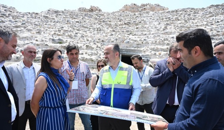 Bursa Büyükşehir Belediye Başkanı Alinur Aktaş, beraberindeki İznik Belediye Başkanı Kağan Mehmet Usta ile birlikte tarihi İznik Roma Tiyatrosu’nda devam eden çalışmaları yerinde inceledi. Uygulamaları tamamlanma aşamasına gelen restorasyon projesi hakkında Kazı Başkanı Doç.Dr. Aygün Ekin Meriç’ten bilgi alan Başkan Aktaş, İznik Müze Müdürlüğü başkanlığında devam eden kazı çalışmalarına Büyükşehir olarak destek verdiklerini hatırlattı. Bursa Kültür Varlıklarını Koruma Bölge Kurulu’nca onaylı proje kapsamında çalışmaların sürdüğünü hatırlatan Başkan Aktaş, “İznik Roma Tiyatrosu projesinde temel yaklaşım; mevcut oturma basamakları, sahne bölümü ve diğer yapı kalıntılarının olumsuz müdahale ve eklentilerden arındırılmasına, uygun bir şekilde korunması için dondurma ve derz işlemi yapılmasına yönelik oldu. Uzun yıllardır İznik turizmine kazandırılmaya çalışılan Roma Tiyatrosu’nda, bizim çalışmalarımızla birlikte, yerli ve yabancı turistlerin alanı gezmesine yönelik gezi güzergâhı oluşturuldu. Oturma basamaklarının üst kısmında yer alan seyir platformu oluşturuldu ve alanın net bir şekilde izlenebilmesi sağlandı. Dondurma işlemleri, derz çalışmaları, seyir platformu ve gezi rotasına yönelik çalışmalar devam ediyor. Aralık ayına kadar çalışmaları bitirmeyi hedefliyoruz. Ben inanıyor ve ümit ediyorum ki ziyaret noktasında Türkiye'deki en iddialı amfi tiyatrolardan bir tanesi olacak ve İznik’in asıl çekim merkezi burası olacak. Sadece İznik için değil, sadece ülkemiz için değil, insanlık adına yapılmış bu çok güzel yatırımı bütün dünyayla buluşturmanın heyecanını yaşıyoruz” diye konuştu.