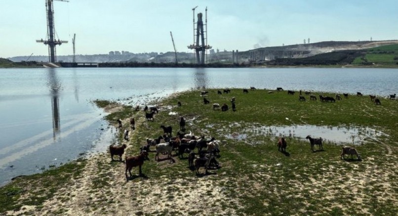 Sazlıbosna'da bir yanda dev ulaşım projesinin önemli ayaklarından biri olan Sazlıdere köprüsü hızla yükselirken, hemen yanı başında keçilerin çoban eşliğinde merada otlamaya devam etmesi dikkat çekti.