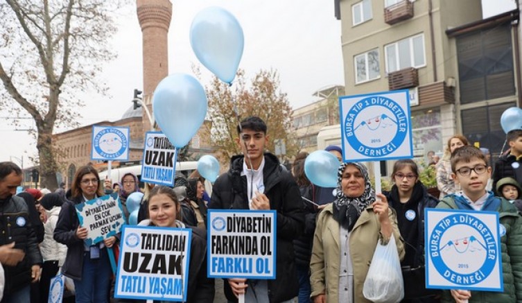 Tüm Türkiye’de olduğu gibi Bursa’da da diyabete dikkat çekmek amacıyla 14 Kasım Dünya Diyabet Günü’nde çeşitli etkinlikler düzenlendi. Bursa Büyükşehir Belediyesi Sağlık İşleri Dairesi Başkanlığı Halk Sağlığı ve Sağlıklı Yaşam Şube Müdürlüğü ile Bursa Tip 1 Diyabetliler Derneği işbirliğinde farkındalık oluşturmak amacıyla yürüyüş düzenlendi. Büyükşehir Belediyesi Bandosu eşliğinde Cumhuriyet Caddesi’nde yürüyen çocuklara, Büyükşehir Belediyesi Genel Sekreter Yardımcısı Mehmet Emin Direkçi, Sağlık İşleri Dairesi Başkanı Düşünsel Şentürk, İl Sağlık Müdürlüğü Halk Sağlığı Hizmetleri Başkan Yardımcısı Dr. Yunuz Arslan, Bursa Tip 1 Diyabetliler Dernek Başkanı Yadigar Aydın, Bursa Uludağ Üniversitesi Tıp Fakültesi Dekan Yardımcısı Prof. Dr. Erdal Eren, Bursa Eczacı Odası Başkanı Eczacı Adnan Erakın ve aileler eşlik etti.