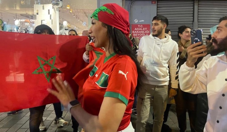 Dünya Kupası son 16 turunda İspanya’yı penaltılarla 3-0 yenerek çeyrek finale çıkan Fas Milli Takımı’nın galibiyeti Taksim’de coşkuyla kutlandı. Ellerine bayraklarını alan Faslı taraftarlar coşku içinde şarkı söyledi. Küçük gruplar halinde yapılan kutlamalara çevik kuvvet ekipleri güvenlik gerekçesiyle izin vermeyince, Fas taraftarları olaysız bir şekilde dağıldı.