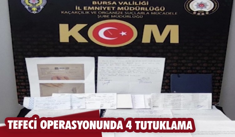 Bursa Cumhuriyet Başsavcılığı koordinesinde Kaçakçılık ve Organize Suçlarla Mücadele Şube Müdürlüğü ekipleri tarafından yapılan operasyonda çok sayıda şahsa faiz karşılığı borç para vererek tefecilik faaliyetinde bulunan ve milyonlarca lira haksız kazanç elde ettiği tespit edilen Y.G, M.G.T, S.D, U.G isimli 4 şüpheli şahıs yakalanarak gözaltına alındı.